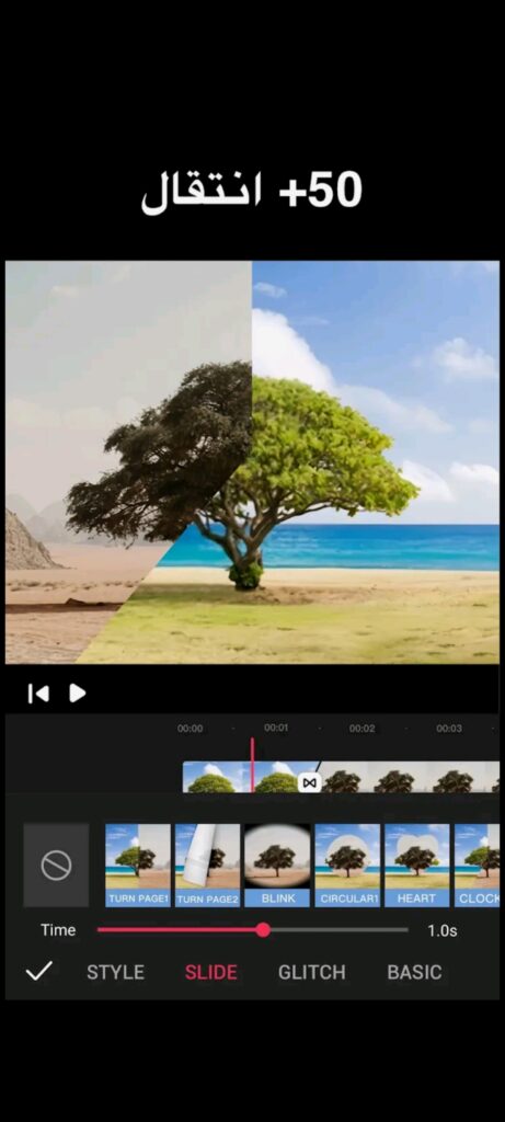 يحتوي التطبيق على مجموعة متنوعة من الفلاتر والتأثيرات التي تضيف لمسة فنية وجمالية على مقاطع الفيديو، مثل تأثيرات السينما، الألوان، والتشويش وغيرها.